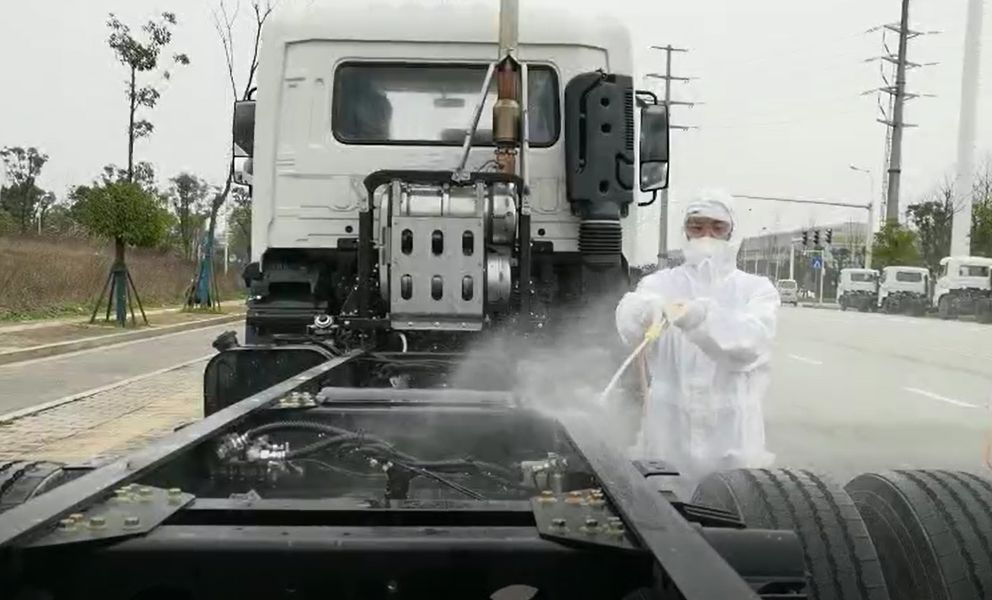 东风商用车生产基地在湖北十堰疫情重灾区,东风商用车的物流司机将底盘车送至湖南境内的高速路口岳阳北收费站后返回湖北集中隔离,再由HTH.COM华体会环境的物流司机接回厂区。整个交接运输过程中,每一辆底盘车在出厂、高速路口、HTH.COM华体会环境长沙园区必须经历三次的专业消毒,确保安全,万无一失。